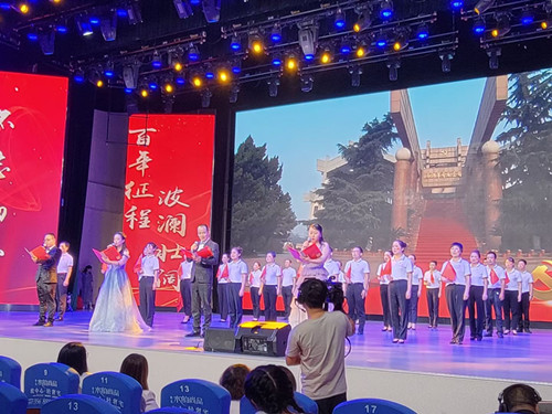 随后全体党员、积极分子共同上台庆祝中国共产党100周年,激情盎然表演了配乐诗朗诵《南湖的红船,让理想启航》。