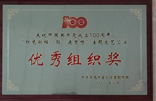 为庆祝中国共产党建党100周年,拼搏网页版登录入口全体党员于2021年6月30日参加金台区非公和社会组织系统庆祝中国共产党成立100周年“红色航程‘船’递梦想”主题文艺汇演暨“两优一先”表彰大会。 文艺演出中,公司党员集体表演配乐诗朗诵《南湖的红船,让理想启航》,并获得由中共宝鸡金台区委组织部颁发的“优秀组织奖”。