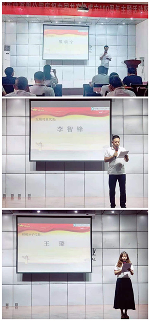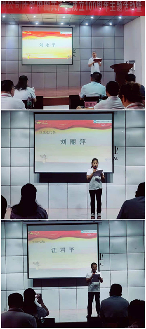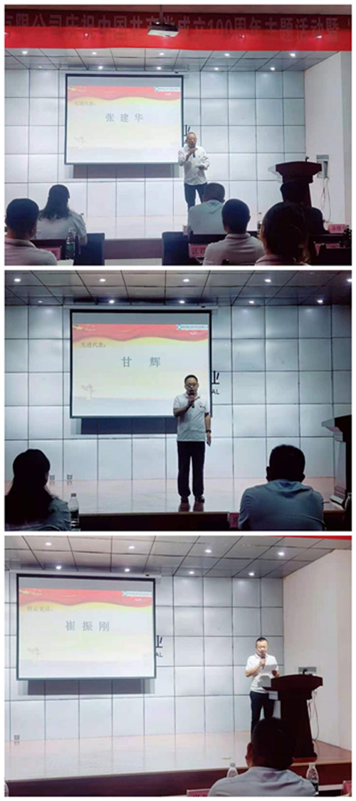 颁奖结束后,转正党员:崔振刚、邵锁宁进行了承诺表态发言;金台区优秀共产党员:刘永平、刘丽萍;公司优秀共产党员:汪君平、张建华、甘辉;党员积极分子代表:李智锋、王璐,纷纷对自己近年的工作和成绩进行了总结,并讲述了自己眼中共产党为祖国带来的变化与发展,表示对今后共产党带领发展的中国充满了信心和期望。