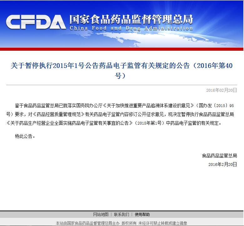 关于暂停执行2015年1号公告药品电子监管有关规定的公告(2016年第40号)
